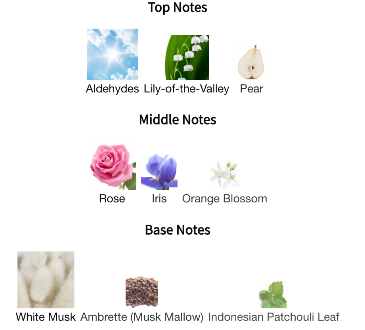 | Top Note | 배, 앨더하이드, 클린 머스크 | 상큼하고 깨끗한 첫 인상, 세탁된 린넨 느낌 |